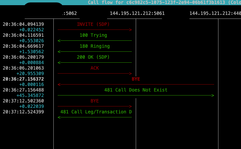 | 3 | Zoom SBC | 481 | Freeswich | Zoom responds with 481 (Call/Transaction Not Found) because they terminated teh session during the intial BYE. |